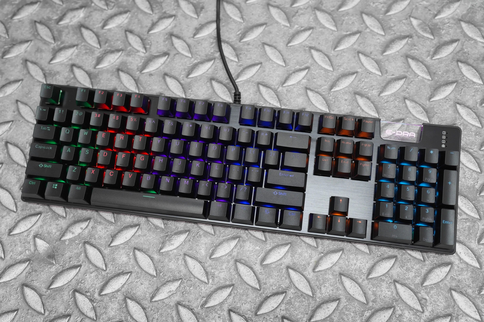 Bàn phím sử dụng layout ANSI vì vậy mà dễ dàng làm quen với bàn phím. Với giá thành dễ tiếp cận, thiết kế hiện đại nên E-DRA EK312 chỉ được gắn LED Rainbow. Tuy vậy LED của EK312 có độ sáng khá cao và đều. LED Rainbow phân màu theo vùng ấn tượng. Mặc dù có thiết kế vỏ mỏng, nhưng nhìn chung E-Dra EK312 vẫn có chất lượng Build tốt.